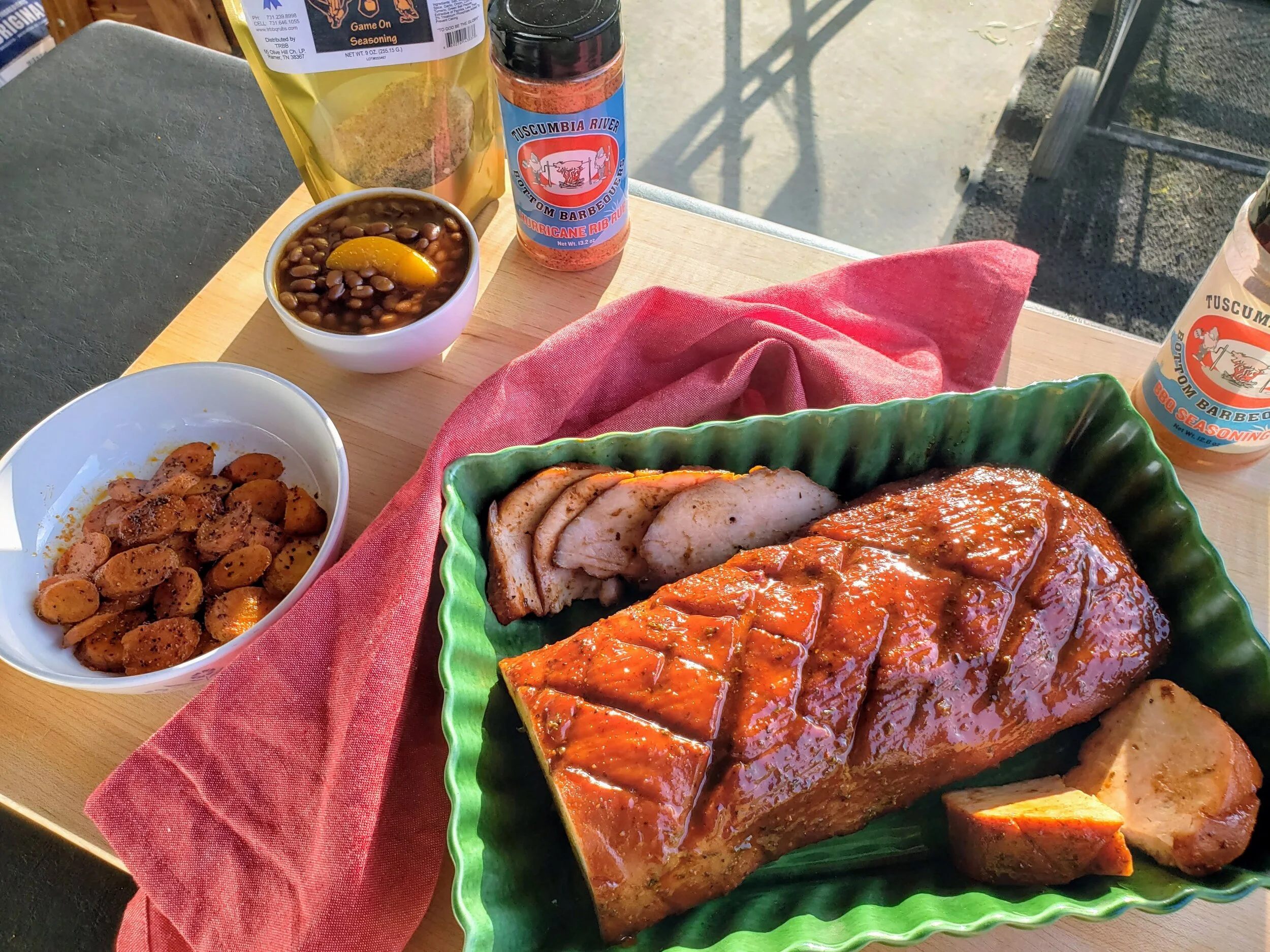 Mix together 2 parts Hurricane Rib Rub to 1 part Game On seasoning. Sprinkle on all sides of loin. Be sure to get in the cracks of the diamond cuts.