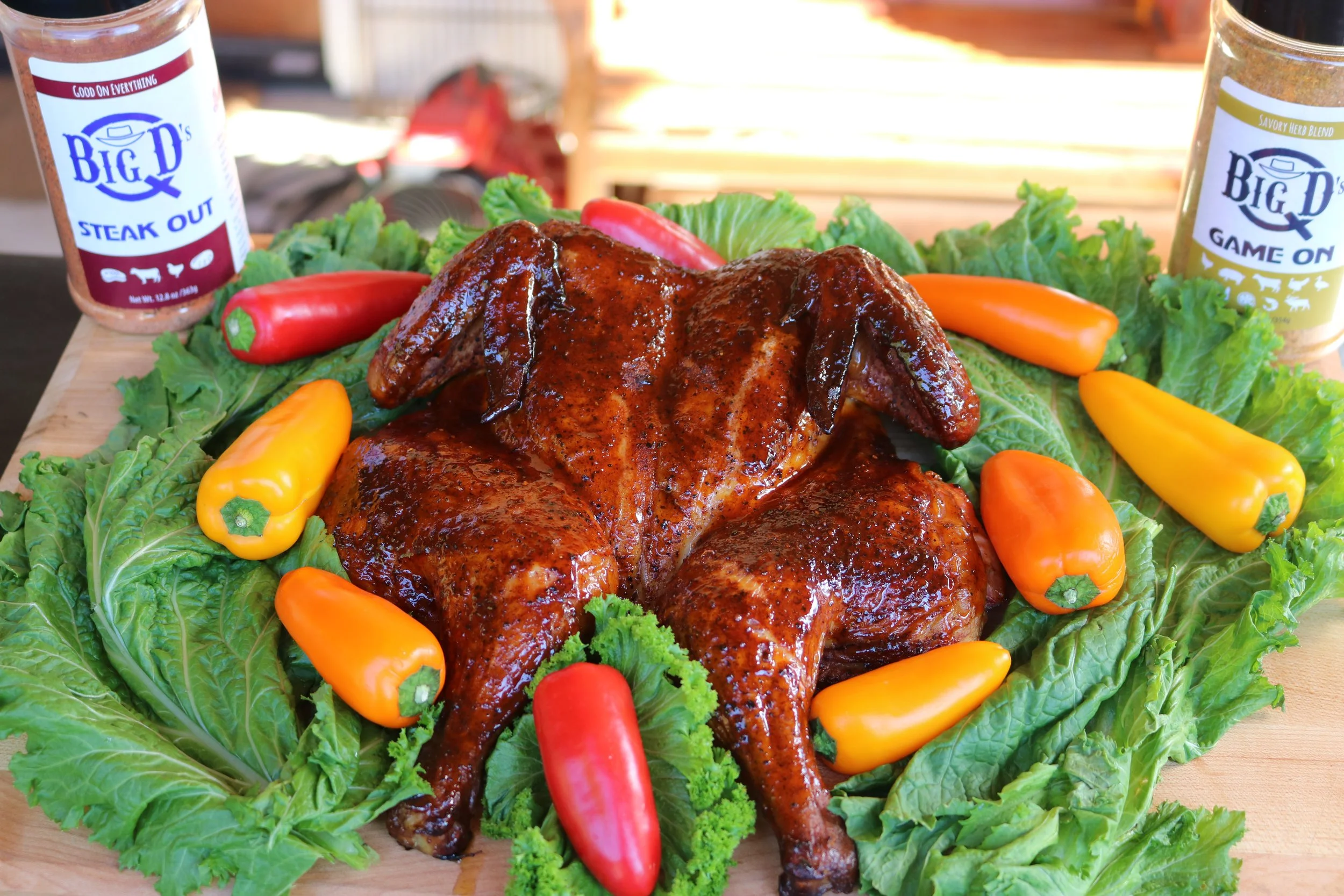 On the bottom/bone-side of the bird, layer with Big D’s Q GAME ON seasoning.